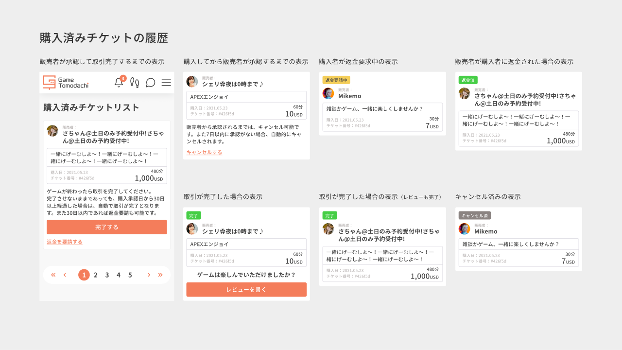 アイディアの段階では、「完了する」「返金を要求する」「キャンセルする」は同じボタンを配置していました。 しかしユーザーが既に購入した後に返金をすることやキャンセルをすることは、取引を完了することよりも頻度が高くないので、2つのボタンをテキストリンクに変更してより整理された画面にしました。