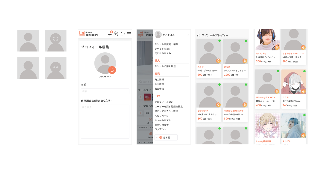 GameTomodachiをゲームのような世界観をつくるか議論をした結果、どの国でも使えるプレイヤー同士のマッチングアプリとしてデザインする方針に決めました。 アバターは、顔に表情を持たず男女偏りのないイラストを採用しました。