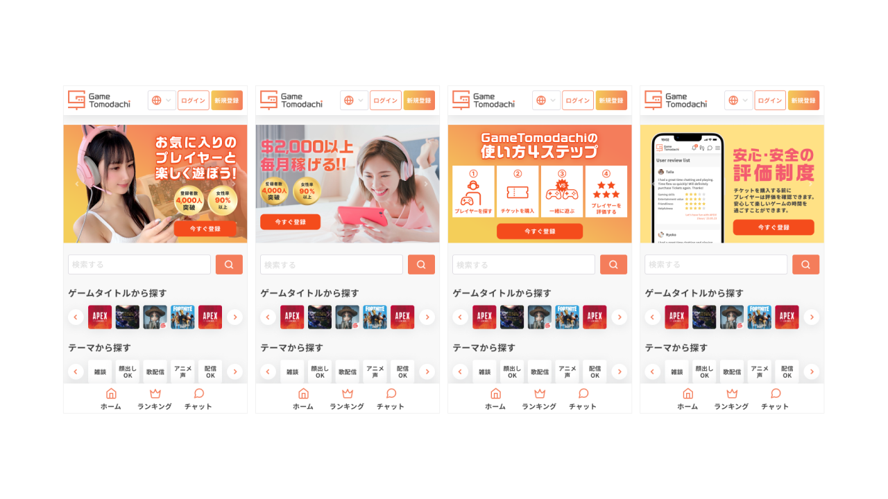 GameTomodachiはゲームプレイヤーと繋がってコミュニケーションをたのしむマッチングサービスです。ビジュアルデザインから画面の設計やフロントコーディングまで携わりました。