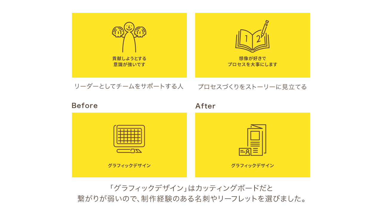 「自分の特徴」は抽象的な表現になるので、文章からさらに深堀りして決めました。 また「自分に出来ること」は具体的に制作できるものをイラストにすることで、イメージしてもらえるように考えました。